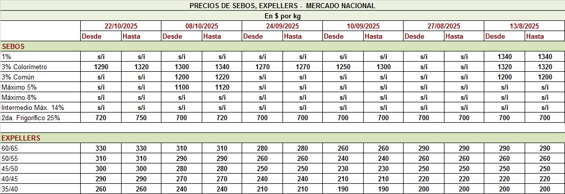 El precio de los sebos domésticos, al 8/10/25, muestra un repunte moderado, en un contexto de poca oferta y poca demanda, con compradores que se retiran ante la incertidumbre política-económica.