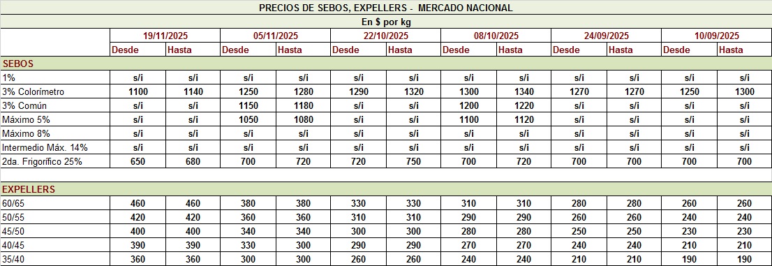 El pecio de los sebos nacionales al 19/11/25 muestran una baja considerable con respecto a la quincena anterior. Esto ocurre en un contexto de incertidumbre, desinterés de la demanda por estos productos y una menor oferta.