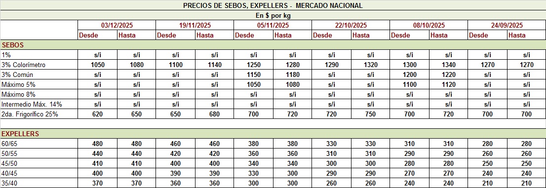 El precio de los sebos nacionales, al 22/10/25, muestra cotizaciones similares a la quincena anterior, en un contexto de marcada incertidumbre, con compradores retirados del negocio y mucha especulación.
