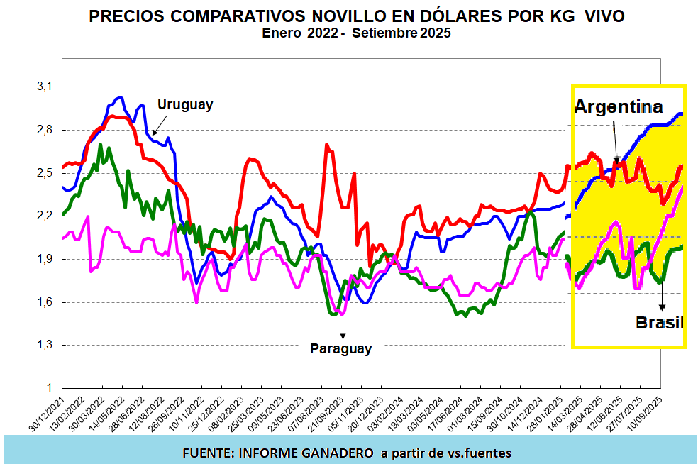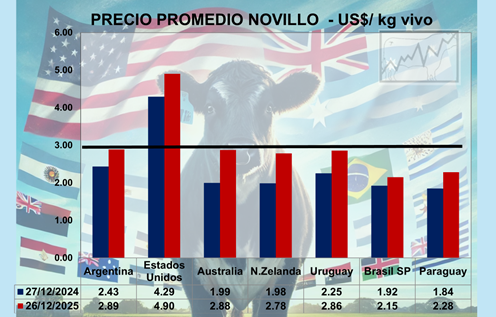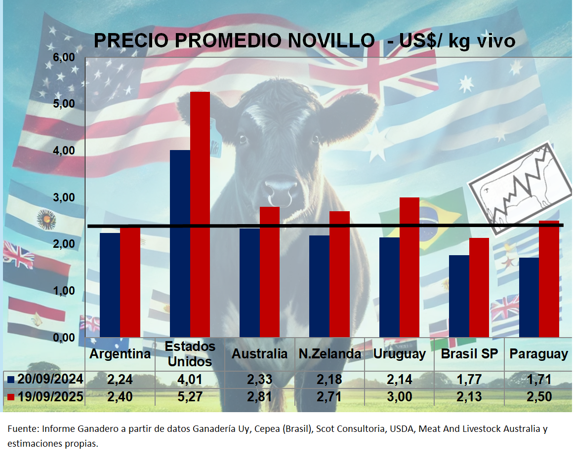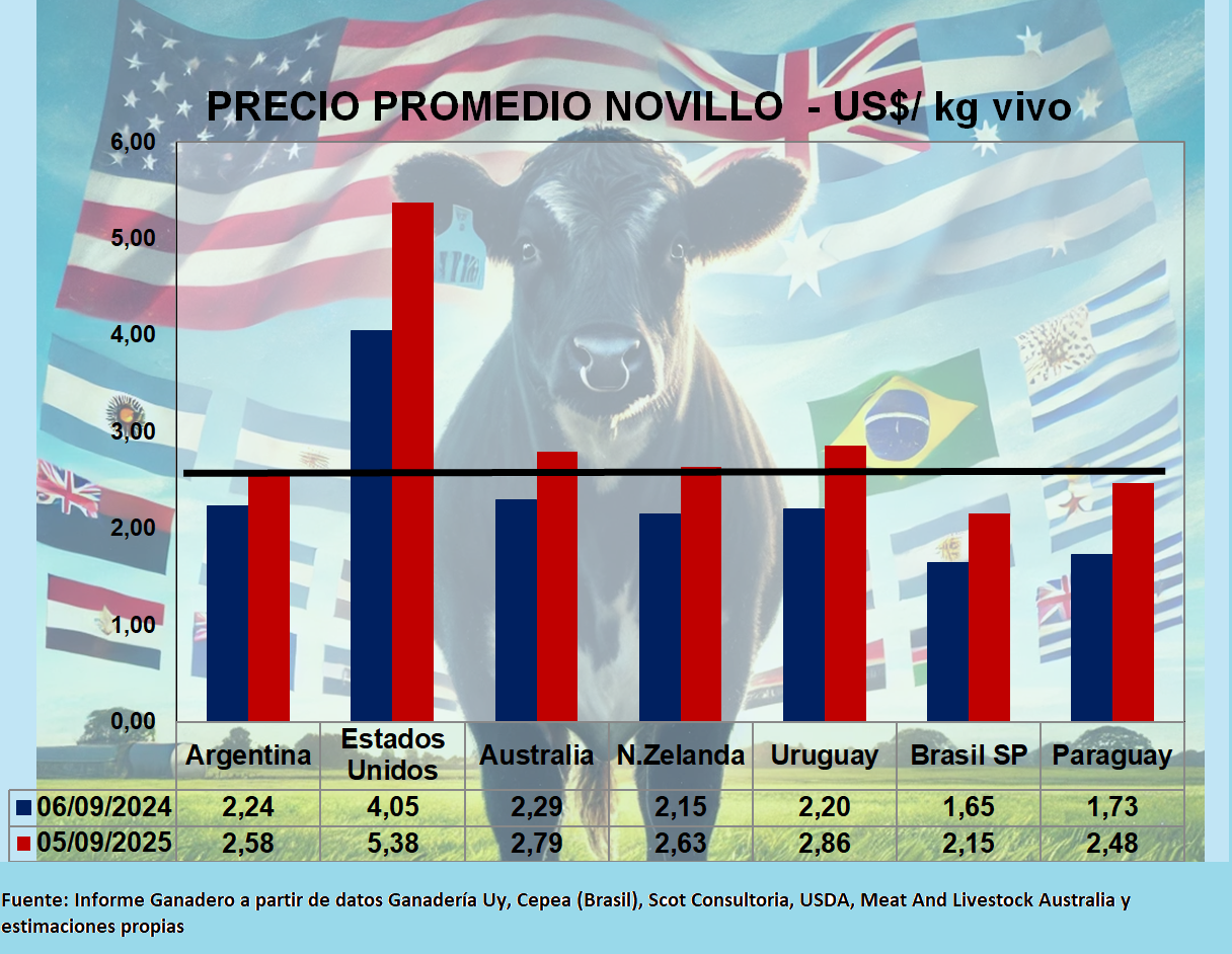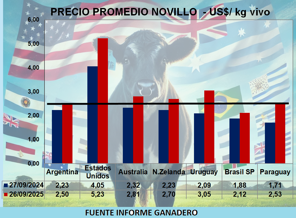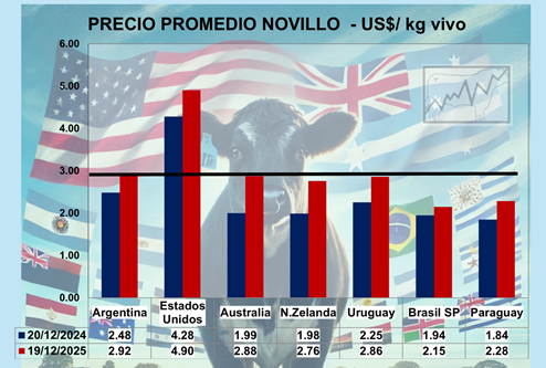 Precios Comparativos en US$ Novillos - Vacas en Argentina, Brasil, Uruguay, Paraguay, Australia, Nueva Zelanda y Estados Unidos