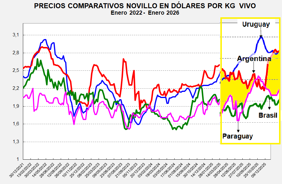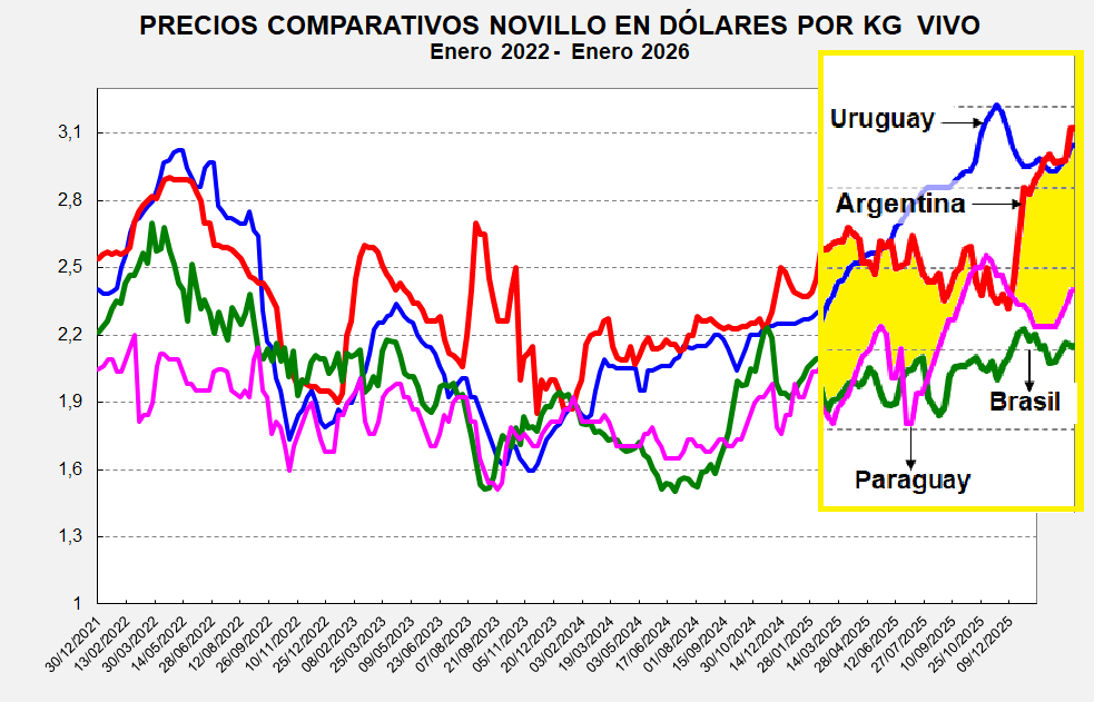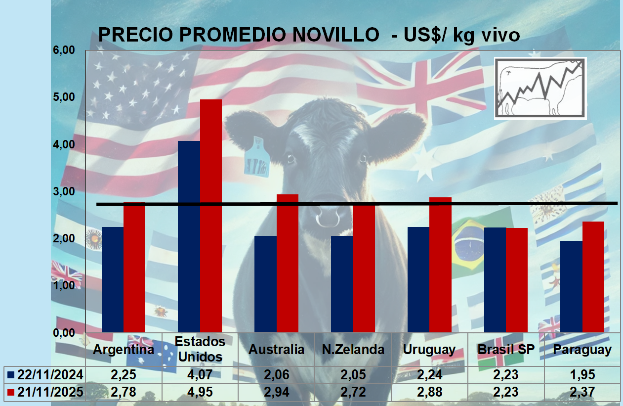 Precios Comparativos en US$ Novillos - Vacas en Argentina, Brasil, Uruguay, Paraguay, Australia, Nueva Zelanda y Estados Unidos