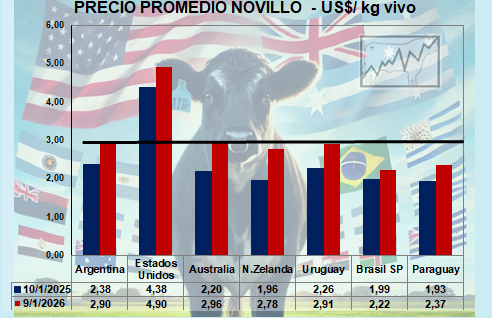 Precios promedio de novillos, vacas en US$ Argentina, Brasil, Uruguay, Paraguay, EE.UU. , Australia y Nueva Zelanda.
